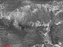 Hildenbrandia comprises orderly layers of vertical oblong cells with thick vegetative cell walls, occasionally connected by secondary pit connections with pit plugs in the septal pores.[5] It grows at its margins, away from the centre, and is able to quickly repair any gaps arising by regenerating from a basal layer of cells.[6] As plants become more mature, they become multi-layered and strongly pigmented near their centres, whilst their single-layered margins begin to grow more slowly.[6] Multi-layered areas may develop in the margins; these will detach and float away as gemmae to form new colonies, leaving a single layer of cells beneath them once they separate from the host plant.[6]