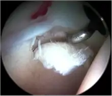 Figure 8.Cartilage delamination. A small area of acetabular cartilage has lifted from the underlying bone, being demonstrated by use of the arthroscopic probe