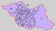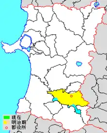 Historic Hiraka District – 1.Yokote 2.Masuda 3.Asamai 4.Numadate 5. Ōmori 6.Kakumagawa 7.Sannai 8.Sakae 9.Daigo 10.Jūmonji 11.Ueda 12.Mutsuai 13.Yoshida 14.Fukushi 15.Satomi 16.Yazawagi 17.Tateai 18.Age 19.Tanemori 20.Asahi 21.Asakura 22.Sakemachi 23.Kurokawa 24.Kawanishi Purple:Yokote City Light Blue:Daisen City