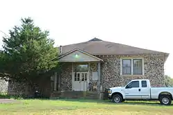 Hirst-Mathew Hall is a historic school building in Bruno, Arkansas. It is located in a complex included several other school buildings south of Arkansas Highway 235, between County Roads 5008 and 5010. It is a single-story stone structure, with a gable-on-hip roof that has exposed rafter ends in the Craftsman style. The main (north-facing) facade has a centered gable-roof porch supported by four columns set on a raised concrete base. The east facade has 14 windows, placed asymmetrically in groups of six, three and five. The west facade has 12 windows in two groups of six. It was built in 1929 as part of the Bruno Agricultural School, and originally housed classrooms. The schools had been founded in 1921 under the Smith–Hughes Act. When it was listed on the National Register of Historic Places in 1992, it was in use as a textile factory.[2]