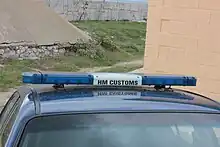 HM Customs have marked road vehicles for customs duties, fitted with blue flashing lights and sirens. The current vehicles are dark blue, with blue and yellow markings and the HM Customs crest as well as appropriate wording.[9]