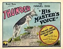 His Master's Voice is a 1925 American silent war drama film directed by Renaud Hoffman and starring Thunder the Dog, George Hackathorne, Marjorie Daw and Mary Carr.[1] It was designed as a vehicle for Thunder, an Alsatian who featured in several films during the 1920s.