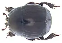 Characteristic to Histeroidea are an accessory posterior ridge (locking device) behind the hind margin and presence of medial loop and apical hinge of wing. The elytra are truncate with 1 or 2 abdominal segments visible. The abdominal 8th segment is completely invaginated in the 7th segment. Each antenna has 8 (seldom 7) segments preceding a club of fused segments. The ventral body surface is glabrous.[1]