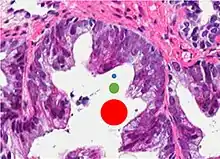 This case could meet the criterion of six times normal nuclear size for intraductal carcinoma of the prostate if size is defined as nuclear area but not if defined as nuclear diameter (blue dot: size of normal nucleus, green dot: size six times normal area and red dot: size six times normal diameter).[19]