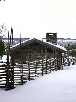 A Jamtish house behind a traditional split-rail fence at Jamtli History Land in Östersund