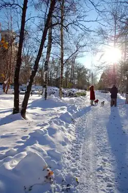 The state tried to persuade the Jamtish traders on Frösön to migrate to the new city but they had no intentions of leaving such a rich parish with the fertile soils Frösön consisted of in favor of the swamp and marshes across the strait. During its first 50 years the city's population only grew by an average of eight people per year.[1] The city became the county seat of the newly founded county consisting of the provinces Jämtland and Härjedalen in 1810, and a county council was established.[5] Though, Östersund remained a de facto farming village with fewer than 400 inhabitants in 1820.[6] The 1840s were slightly better when Jemtlands Tidning (Jämtland's first newspaper) was established, the first church was inaugurated, Frösö Trivial School was located to the city and a general hospital was built. An upswing occurred in the 1850s and 1860s, as trade was liberalized and the logging industry developed.