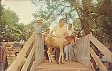 In 1946 children's author Marguerite Henry came to Chincoteague for the summer, intending to write about the wild horses of Assateague and the pony penning and auction on Chincoteague Island.[39] With her came illustrator Wesley Dennis, with whom she had previously worked, and who would take photographs to be converted to pen-and-ink drawings.[40] Staying at the bed and breakfast of Miss Molly Rowley on Main Street, Henry encountered island horse breeder Clarence Beebe, visited his ranch on the southern portion of the island, and met his grandchildren Maureen and Paul. On the Beebe Ranch, Henry saw a young filly named Misty. Henry fell in love with the horse, and tried to persuade "Grandpa" Beebe to sell the filly, promising to include him and his grandchildren in her book. The breeder eventually agreed, on condition Misty remained on the Beebe Ranch until she was weaned, and that the animal was eventually returned to him from Henry's Illinois home for breeding. Henry made the purchase, and returned to the Midwest with an outline of her story. Several months later, Misty arrived by rail. In 1947 Henry's book Misty of Chincoteague was published, about the desire of the Beebe children to have a pony of their own—Misty, daughter of the untamable Phantom. The book became an immediate best seller, and the following year was designated as a Newbery Honor Book by the American Library Association.[39] Following the book's appearance and success, a steady stream of articles on Chincoteague began to appear in national magazines.[41]