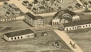 The East Tennessee, Virginia and Georgia rail yard at the intersection of Gay Street (lower right) and Depot Street, as it appeared in 1871; the roundhouse has since been demolished and replaced by the Southern Terminal
