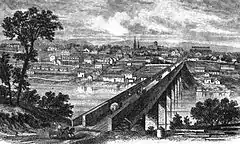 View across the first Gay Street Bridge in the late 1860s; the bridge shown was eventually destroyed by a flood