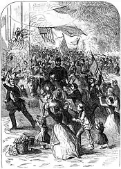 Engraving in Brownlow's Sketches, showing Confederate recruits shooting at Union supporter Charles Douglas during a Gay Street rally in April 1861