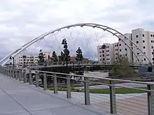 On July 10, 2005, a new trolley station opened on the SDSU campus, after construction began in 1999. The station connected students and faculty with other areas in San Diego county and helped to combat the low availability of parking around campus. The $103 million station was just one of the university's several construction projects that occurred in the 2000s.[85] Starting in the late 1990s, a $500 million College Community Redevelopment Project led to the development of the $8.5 million Piedra del Sol Apartments, the $14.3 million Fraternity Row, and future developments of a $15 million Sorority Row, a $150 million Paseo retail, office, and apartment project, as well as a $125 million research and office park.[86] In 2003, a pedestrian bridge opened, connecting several of the dorms to the main campus.[87] In the same year, the campus's most technologically advanced and largest classroom (capable of holding 500 students) was completed.[88] Through 2008 and 2009, the campus began work on constructing a new alumni center, expanding Aztec Center, and modifying Storm Hall and Nasitir Hall to add more office and classroom space.[89]