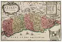 Sussex seems to have had a greater degree of decentralisation than other kingdoms.[4] For a period during the 760s there may have been as many as four of five kings based within the territory, perhaps with each ruling over a distinct tribal territory,[5] perhaps on a temporary basis.[6] It seems possible that the people of the Haestingas may have had their own ruler for a while, and another sub-division may have been along the River Adur.[6]