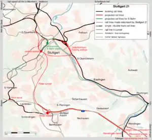 - Choice of the central station (Zentralbahnhof): The various plans had either Cannstatt, Stuttgart, or Berg as alternatives for the central railway station of the network. Because of the location of Stuttgart in the basin of a valley, initially plans called for a connection from Cannstatt or Berg via a secondary connection line only. Etzel later drew up plans that included modern engineering, including the Prague Tunnel and Rosenstein Tunnel, which made possible the location of the central station in the middle of Stuttgart. Since Stuttgart was by far the largest city of the three, and therefore passenger traffic expectation were highest, the decision was made to go with the Stuttgart location, even though its geographical location caused problems that still exist today (see Stuttgart 21).