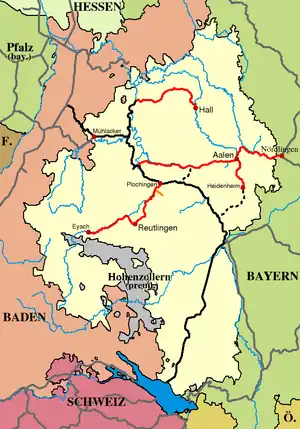 - at the Neckar river: from Eyach to Horb, and, crossing Hohenzollern territory, to Rottweil, then branching off there to Villingen (the Rottweil–Villingen railway), and via Tuttlingen to Immendingen in Baden (now forming the Plochingen–Immendingen railway);