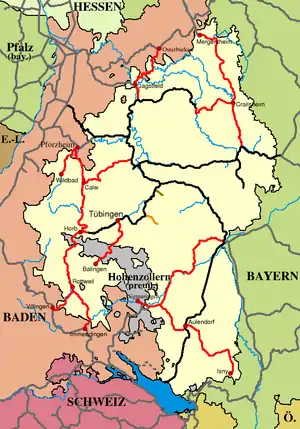 Any additional expansion of the rail network required negotiations with neighbouring states. Along with Bavaria and Baden, these states included Prussia, whose territory of Hohenzollern bordered on Württemberg, and Hesse, whose exclave Wimpfen was situated between Baden and Württemberg.
