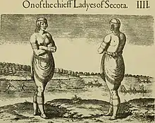 Early explorers to North America made many ethnographic observations about the Indigenous people they met. Initially, they did not have a word for tattooing and instead described the skin modifications as "pounce, prick, list, mark, and raze" to "stamp, paint, burn, and embroider."[25]:3 In 1585–1586, Thomas Harriot, who was part of the Grenville Expedition, was responsible for making observations about Indigenous People of North America.[26] In A Brief and True Report of the New Found Land of Virginia, Harriot recorded that some Indigenous people had their skin dyed and coloured.[26]:11 John White provided visual representations of Indigenous people in the form of drawings and paintings.[26]:46–81 Harriot and White also provided information highlighting specific markings seen on Indigenous chiefs during that time.[26]:74 In 1623, Gabriel Sagard was a missionary who described seeing men and women with tattoos on their skin.[27]:145