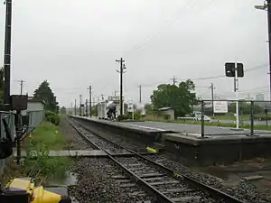 The station consists of a single island platform with a level crossing. There is no station building and the station is unattended.