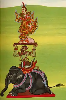 Hnamadawgyi (Burmese: နှမတော်ကြီး, pronounced [n̥əma̰dɔ̀dʑí]; lit. "Royal Sister"; also known as Shwemyethna) is one of the 37 nats in the Burmese pantheon of nats. She is the nat representation of Myat Hla, sister of Maung Tint De. According to tradition, she was a queen of the King of Tagaung. When she saw her brother Tintde being burned alive, she leapt into the fire, but only managed to save his head. She died of her burns and became a nat. She is portrayed standing on a dais upon a black elephant, her right hand on her chest with a plum between her thumb and index finger, and her left hand by her side.[1] She is also known for having a monkey companion, Shwe Min Wun.[2]