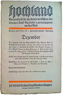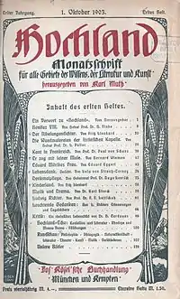 Hochland was, according to its subtitle, a monthly magazine for all areas of knowledge, literature, and art. In the inaugural volume, Muth stated that the magazine was not to be the newsletter for any party, group, or existing movement. He envisioned a magazine focused on religion and art, and had great faith in the educational power of art and aesthetics to help alleviate cultural and political problems.[2] Though the magazine itself was not to be specifically political,[3] Muth developed close friendships with politically active people such as Hans and Sophie Scholl.[4] From 1903 to 1932 it was edited by Carl Muth, then, until 1935, by Friedrich Fuchs, and from 1935 to 1939 again by Muth, and from 1939 until 1941, when it was banned by the Nazis, by Franz Joseph Schöningh. Its circulation in 1939 was 12,000.[5]