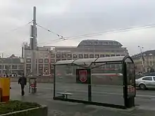 Trolleybus stop at Hodžovo Square, today the lower part of the picture (including the patch of grass) is behind a fence