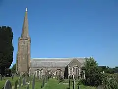 The parish church (All Saints) was dedicated by Bishop John Grandisson in 1336. Described by Nikolaus Pevsner as "unusually impressive", it has both north and south aisles and owes much of its interest to the Victorian restoration undertaken by J. D. Sedding between 1885 and 1889 which was funded by Henry Mildmay of Flete. However, the tower and spire survive from the 14th century; there is a square Norman font carved with lions, a tree and leaf decoration; and the rood screen, c. 1535, restored by Sedding, is very finely carved. The east window contains stained glass by Heywood Sumner (1866), and later windows in the north aisle are by Hugh Easton.[13]