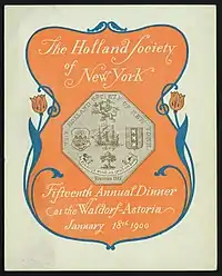 The Holland Society is known for initiating projects such as the New Netherland Project, which translates and publishes 17th-century records from the New York State Archives.[1] The society also sponsors projects like The Papers of Jacob Leisler Project and Records of the Translations of the Reformed Protestant Dutch Church of Flatbush, Kings County, New York. Its motto, Eindelijk wordt een Spruit een Boom ("Finally, a sprout becomes a tree"), reflects its commitment to preserving Dutch heritage.