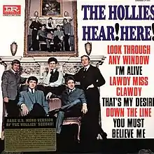 In November 1965, Imperial released Hollies, with a slightly different track listing, as Hear! Here! in the US. Imperial removed "Fortune Teller" and "Mickey's Monkey" from Hollies and added the singles "I'm Alive" and "Look Through Any Window". The track listing was then re-arranged so that the singles started each side.
