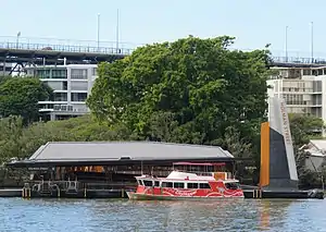 The wharf was destroyed during the January 2011 Brisbane floods.[5] A temporary replacement opened on 18 April 2011.[6][7] The temporary wharf closed in April 2015 to allow a new "permanent" wharf to be built.[8][9] It opened on 23 June 2015.[10][11] The Ferry Terminal was once again destroyed during the 2022 eastern Australia floods, when struck by a house boat.