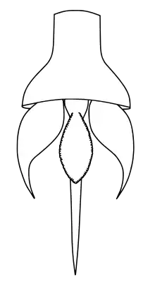 Although the precise size of Holmipterus is uncertain,[2] the size of its fossils means that it must have been a relatively large eurypterid. Estimates based on the specimen indicates a length of around one metre.[3] The most distinctive feature of Holmipterus was its telson (the posteriormost division of its body), which was unique among the eurypterids. Per the description, the pretelson (the segment immediately preceding telson) not only supports a spike-shaped and thin, yet robust, telson, but also two articulating 'cercal blades', meaning that the pretelson-telson assemblage could function as a 'formidable grasping weapon'.[3] As (other) Carcinosomatoid eurypterids could, it is possible that Holmipterus could push its tail up "overhead", similar to a scorpion.[3] The telson itself was curved downwards and had a serrated and flat platform near the base. The most complete telson found measured 8.65 centimetres (3.4 in) in length and was 1.46 centimetres (0.57 in) wide at the widest part of the serrated platform. Larger, less complete specimens are known, including a telson which was 1.82 centimetres (0.72 in) wide at the same point.[3]