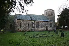All Saints' Church is a Grade I listed Anglican church.[4] Kelly's mentions that it comprises a chancel, nave, aisles and south porch, and a square tower containing three bells, with the chancel incorporating richly painted frescoes and a carved oak screen separating the chancel from the nave. Benches were carved by a Mr Swaby of Marsh Chapel when the chancel was rebuilt in 1851 by a Mr Nicholson of Lincoln.[3] The church was restored in 1859-60 and 1870-74 by George Gilbert Scott, who rebuilt the north arcade and added, according to Pevsner, a "glittering mosaic reredos... made, according to Canon Binnal, by a Catholic Italian who insisted on smoking his pipe while doing it". Also noted was a chalice and paten cover dated 1569[5] Scott also repaired both aisles, and rebuilt a mortuary chapel and the whole roof.[3]