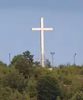 The stainless steel cross erected in 2008. The floodlights that illuminate the cross at night are visible. The Stainless Steel cross was removed in 2013 to make way for a new and larger lighted cross.