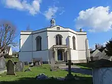 Holy Trinity is built of rendered Wedmore stone, with freestone dressings and a slate roof. The church is made up of a nave with gallery, chancel, vestry and west porch. The centre of the roof has an arcaded cupola containing one bell and surmounted by a cruciform. The church has an octagonal plan with projecting wings on each side. The entrance has a flat-roofed porch of ashlar stone.[2][6]