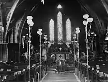The second Holy Trinity Church was designed by the Queensland Colonial Architect, F D G Stanley, who supplied the plans free of charge. The building was constructed of wood, and was of a Gothic design with a steeply pitched roof covered with shingles, sited on the southern side of the grounds and capable of holding a congregation of 500. This Church was fitted with a pipe organ, an altar of carved English oak, and carved oak rails in memory of prominent people with strong associations with Holy Trinity Parish. Lighting was by gas, with ornate brass standards, about seven feet tall, each surmounted by a cluster of three lamps representing the Trinity.[1]