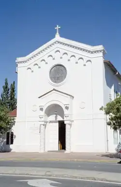 The front facade has a central projecting bay, with a group of three archways at the entrance. Above is a group of three arched windows housed within a large round arched recess .[1]