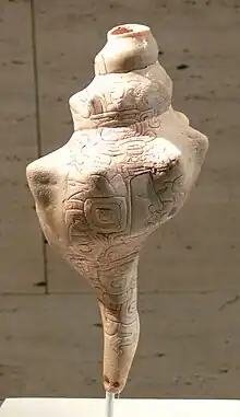 Conch shells were also used as hom. A small hole was drilled at the apex of the shell's spire, through which the musician blew. Many Maya conch trumpets had three ventages to produce a series of notes. Decorative bands were often incised around the shell.[3]
