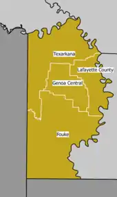 Miller County is located in the southwest corner of Arkansas in the Piney Woods, a temperate coniferous forest. The forests of pine trees initially formed a logging and silviculture industry, though many fields have been cleared from the forest to grow rice, soybeans, corn, and vegetables.[9] The county is also within the Ark-La-Tex region, sharing a tripoint with Texas and Louisiana. The Ark-La-Tex is an economic region anchored by Shreveport, Louisiana, Tyler, Texas, Longview, Texas, and Texarkana. The Red River serves as the northern and eastern boundary of the county, though the watercourse has shifted since the county's reestablishment in 1874. The original Red River continues to serve as the county line between Little River, Hempstead, and Lafayette counties in Arkansas.[10] According to the U.S. Census Bureau, Miller County has a total area of 637.48 square miles (1,651.1 km2), of which 623.98 square miles (1,616.1 km2) is land and 13.50 square miles (35.0 km2) (2.1%) is water.[2]