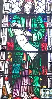 The upper panel of Joseph's window shows the saint wearing a crown of fire, and standing beside the Holy Family and four angels. In the main panel, he wears a gold and red cloak, and is given a blue and green halo.[108] Clarke's depiction of Joseph is based on a 14th-century representation of the prophet Zephaniah now in the Victoria and Albert Museum, London.[126] In contrast to contemporary Catholic representations of Joseph which depict him as a healthy and strong middle-aged man, Clarke shows him in the medieval tradition, as an old and frail man.[127] The lower panel illustrates Joseph's death, with Mary, Jesus, Finbarr, Columcille and a number of other saints kneeling in prayer at his deathbed.[128]