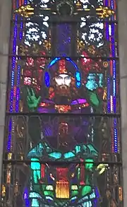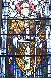 The chapel is dedicated to Finbarr, patron saint of Cork.[113] His window was completed in 1916 alongside Ita's,[114] and is located on the north wall of the nave.[97] Its colour scheme is dominated by a series of red hues. The upper panel depicts his parents who, by legend, were sentenced to death by burning after his mother refused to marry the chieftain Tyagerlach of Rathluin.[97] The panel shows them rescued by the divine hurricane said to have put out the fire about to engulf them.[115] Finbarr, like his mother in the upper panel, has blond hair.[upper-alpha 7] He wears a chasuble coloured in a variety of red and rosepink colours. He holds an ornately decorated crosier in his left hand, and on his right hand is the glove he is said to have worn continuously since the day he met with Christ, who, according to O'Connell "raised the kneeling saint by his right hand, after which it ever glowed with a celestial radiance which could not be obscured, and which was only to be borne if the hand were kept covered with a glove".[97] In the lower register, Finbarr prays alongside bishop Maccuirp, under whom he studied in Macroom.[117]