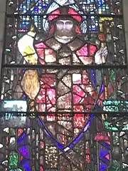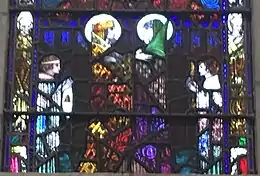 St Brendan's window illustrates episodes from the "Voyage of Saint Brendan the Abbot", first recorded c. 900 AD. Brendan wears a robe of blue, purple, greens and gold hues, and fishnet gloves.[101] In his left hand he holds a paddle as a reference to his reputation as a seaman and voyager.[102] In the lower panel a grotesque, claw-limbed Judas Iscariot appears, described by the writer Lucy Costigan as a "devilish figure surrounded by red and yellow flames",[41][102] his lower body transformed into that of a goat.[101] According to legend, Brendan found Judas abandoned on a rock in the ocean, condemned to be tormented for eternity by demons. In another traditional recounting, he arrives at an island referred to as the "Paradise of Birds", where birds sing psalms "as if with one voice"[73] in praise of God; Clarke reflects this in the depictions of birds on the window's borders.[73] As with several of Clarke's windows at Honan, Brendan's panels reflect the artist's taste for the macabre, especially in what Costigan describes as "the woefully metamorphosed fallen angels from the Paradise of Birds island" and "Brendan's sore-tried contemporaries" lining the window's borders.[103]