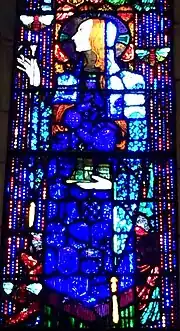 Clark depicts Brigid in a blue cloak and robe, wearing a white headdress decorated with spirals. A large angel wearing a multi-coloured robe is positioned above her,[92] while another four hover at her feet. She holds a representation of Kildare Cathedral, which she is said to have founded.[93] A lamb alongside her represents faith, while the calf signifies innocence.[94] The window was well received by critics when first shown in Clarke's studio in Dublin, and was a key element in his attaining the commission for the Honan windows.[95]
