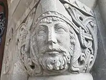 The mouldings around the tops of the five arches on the west façade are carved with lozenge and pellet decoration.[37] The doorway at one point had an iron grille which has since been removed. It is capped by three limestone ribbed vaults,[39] supported by capitals carrying reliefs of the heads of six Munster saints: Finbarr of Cork, Coleman of Cloyne; Gobnait of Ballyvourney; Brendan of Kerry, Declán of Ardmore and Íte of Killeedy.[43] The reliefs were sculpted by Henry Emery, assisted by students at the nearby Cork School of Art.[43] The tympanum over the door was designed by the sculptor Oliver Sheppard and is dominated by the figure of St. Finbarr, dressed in bishop's vestments.[37][39]