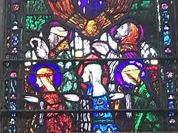 The lower, rectangular panel represents the doorway and is set against a background of branches and leaves attached in silver-gilt; it shows the Lamb of God standing on a brightly coloured altar decorated with three-ringed crosses and two angels acting as servers kneeling before it.[15][55] The dove is surrounded by what Teehan describes as "the deep blue void of Heaven".[55] Here, he is accompanied by flights of angels, carrying instruments of the Passion.[15] The enamel embellishments are by the Irish craftsman and stained glass specialist Oswald Reeves[56] and described by Teehan as the best of his work.[55]