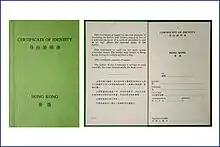 The Hong Kong Certificate of Identity (CI) was a formal travel document and passport, issued by the Hong Kong Government's Immigration Department until 30 June 1997 (See transfer of sovereignty over Hong Kong). It is no longer possible to possess a valid CI as a travel document, as all CIs have expired by 30 June 2007, though most CI holders should be eligible to hold the HKSAR Passport.