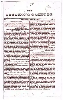 The current form of Hong Kong's government gazette began on 24 September 1853 when the Hongkong Government Gazette (香港政府憲報) started publication, following a proclamation by William Caine, the Colonial Secretary, that it would become "the only Official Organ of Proclamations, Notifications, and all Public Papers of this Government".[3] Prior to this, the Hong Kong Gazette was an earlier government gazette in British Hong Kong, which was amalgamated with the Friend of China in 1842. The Friend of China remained the government gazette between 1842 and 1845.[4]