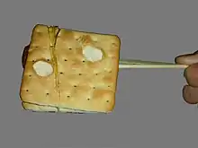 This snack is made of two pieces of crackers stuffed with sticky sweet maltose in the middle, rolled up on a thin strip of bamboo.[40]