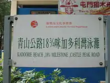 The old trunk roads built in the early 20th century connecting Kowloon and New Territories, including Castle Peak Road, Tai Po Road, Clear Water Bay Road, were traditionally measured in miles from Tsim Sha Tsui Star Ferry. Stone mileposts were erected along the way but they are gradually lost to time.[4] Although this system is no longer in official use today, they are still commonly used for describing locations on the Castle Peak Road, with the Chinese character 咪, being a phonetic transcription of "mile", used instead of 哩 or 英里, and sometimes form the official address of establishments en-route (for example, the address of Kadoorie Beach is 18¾ milestone, Castle Peak Road (Chinese: 青山公路18¾咪)). The shopping mall of CDW Building was renamed Chinese: 8咪半 after refurbishment in 2016 based on the old milestones.[5]
