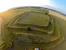To the east of Honington are earthwork remains of an Iron Age fort, measuring 130-by-116-metre (427 by 381 ft) with defensive banks and ditches. There a hoard of Roman coins was found in 1691, although an investigation in 1976 could find no evidence of Roman occupation.[1][2] The 1885 Kelly's Directory view of the earthworks "on the heath near the village" is that it is the site of a Roman Camp with fosse and vallum.[3]