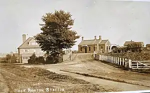The station was built for the Banbury and Cheltenham Direct Railway, which was operated by the Great Western Railway before complete takeover in 1897.[1] Following the passing of the Act of Parliament in 1873 authorising the construction of the B&CDR, it was announced in 1874 that a station would be provided at Hook Norton.[2] The location originally proposed was north of the Milcombe Road and a start had been made on construction at this site but this was abandoned in 1883 in favour of a site to the south, slightly nearer the village.[3]