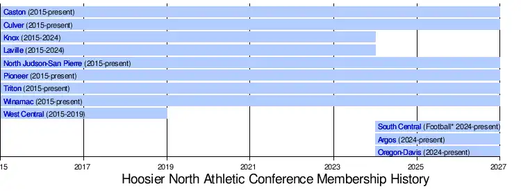 - 2023: The Hoosier North Athletic Conference announced on May 18 that Argos and Oregon-Davis would be joining the conference. It is important to note that neither of these schools has a football program and would participate in all other sports aside from football.[5]