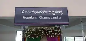 Hopefarm Channasandra (formerly known as Channasandra) is an elevated metro station on the East-West corridor of the Purple Line of Namma Metro in Bengaluru, India, which serves the main Channasandra neighbourhood area. Around this station, holds the Kadugodi metro depot followed by some locations like Prestige Park View apartment, few shopping centres and many more.[1][2][3]